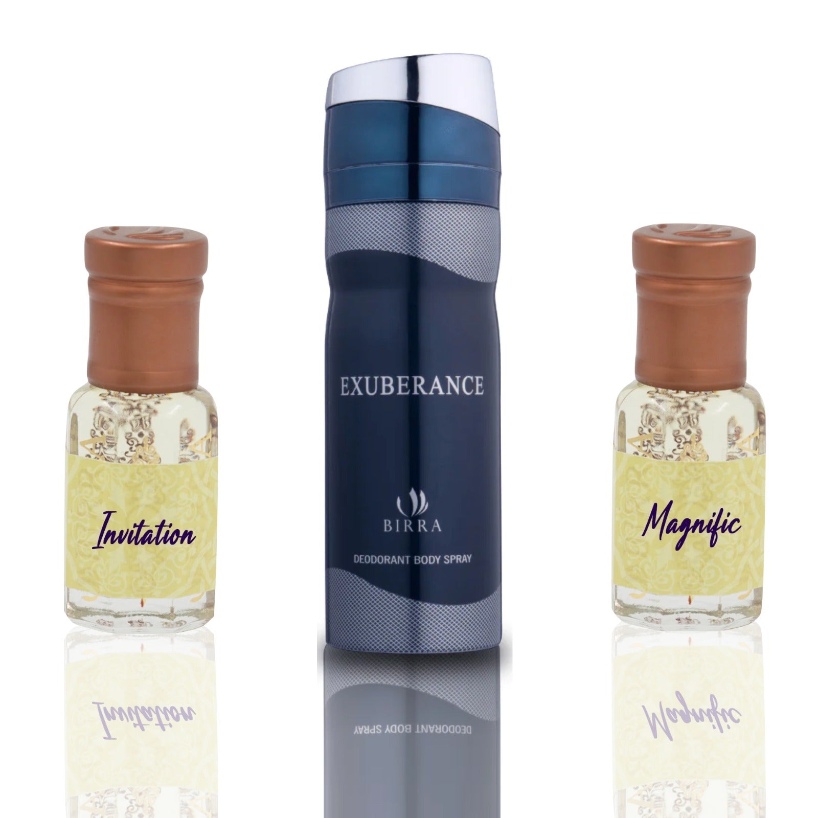 Introducing Blissful Harmony, a captivating combo pack that brings together the refreshing scents of Invitation, Exuberance Deo and Magnific. Invitation offers a unique blend of citrusy and herbal notes, combined with a touch of marine essence, while Magnific brings a fresh and fruity opening with a floral and woody undertone.