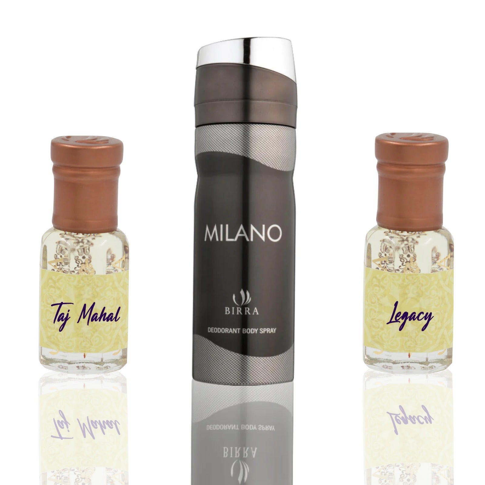 Experience the captivating allure of our combo pack, featuring Legacy, Milano Deo, and Taj Mahal. Legacy refreshes with a fruity opening and complex floral notes. Milano Deo exudes elegant Italian charm.